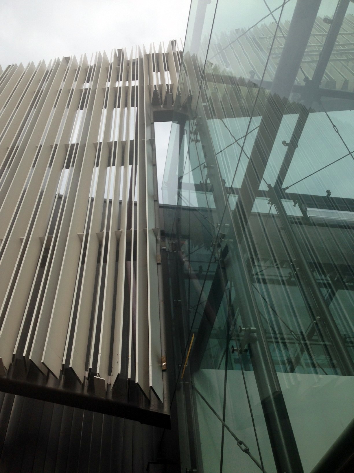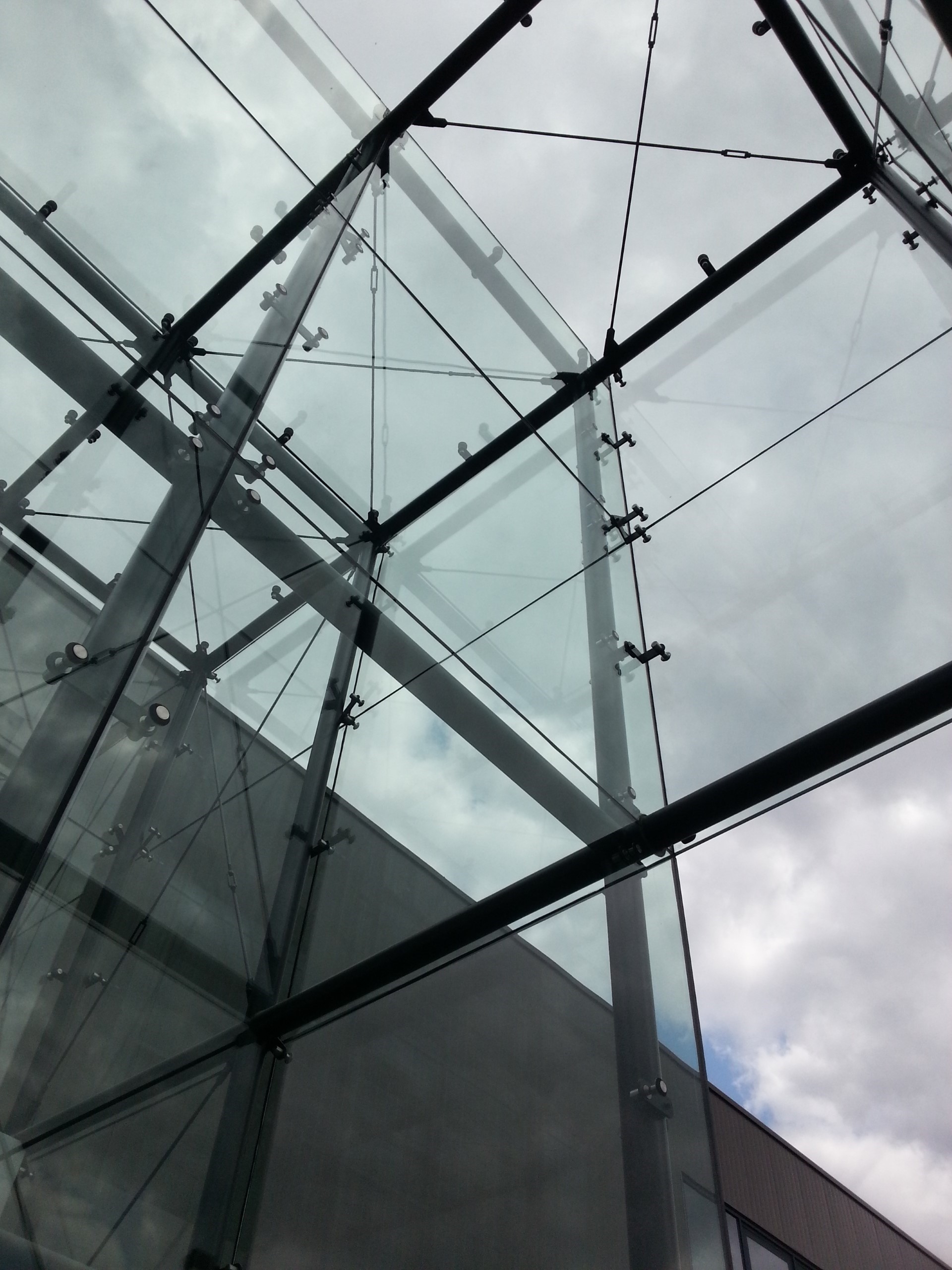 Schon von der Südautobahn aus sind die Eingänge der Shopping City Süd bei Wien deutlich zu erkennen. Die Fassade beider Baukörper besteht aus Alu-Lamellen mit insgesamt 725 m2 und einer Stahl-Glas-Konstruktion in Form eines Würfels mit einer Kantenlänge von 10 m. Die Alu-Lamellen haben eine Gesamtlänge von fast 3 km. Die Stahlbauer von Thomas Lorenz berechneten und planten die Stahltragkonstruktion für die ausführende Firma Metallbau Heidenbauer GmbH & Co KG. Dabei galt es besonderes Augenmerk auf die doppelte Krümmung der Fassade zu legen.
