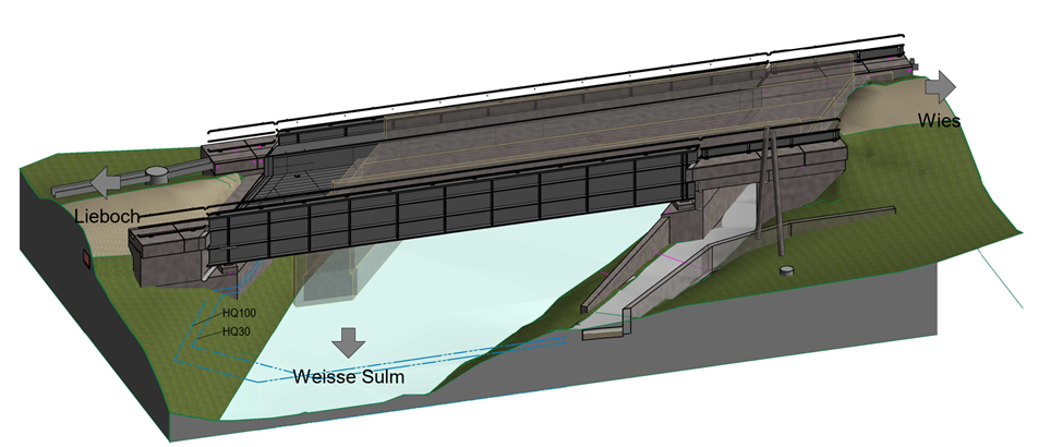 Im Jahr 2022 wurde die 125 Jahre alte Fachwerkbrücke über die Weiße Sulm zwischen dem Bahnhof Wies-Eibiswald und Wies-Markt durch ein neues Brückenobjekt ersetzt. Der Neubau setzt sich aus 2 Brückensystemen mit einem Trennwiderlager – nämlich einer Stahltrogbrücke mit mit unten liegender Fahrbahn und orthotroper Fahrbahnplatte sowie einem Stahlbeton-Rahmentragwerk zur Überbrückjung des Geh- und Radwegs – zusammen. Thomas Lorenz war für die komplette Planung zuständig. Sämtliche Planungsphasen wurden 3-dimensional abgewickelt, alle Pläne aus den Modellen abgeleitet und Daten zwischen den einzelnen Planungs- und Rechenmodell via Schnittstelle ausgetauscht.