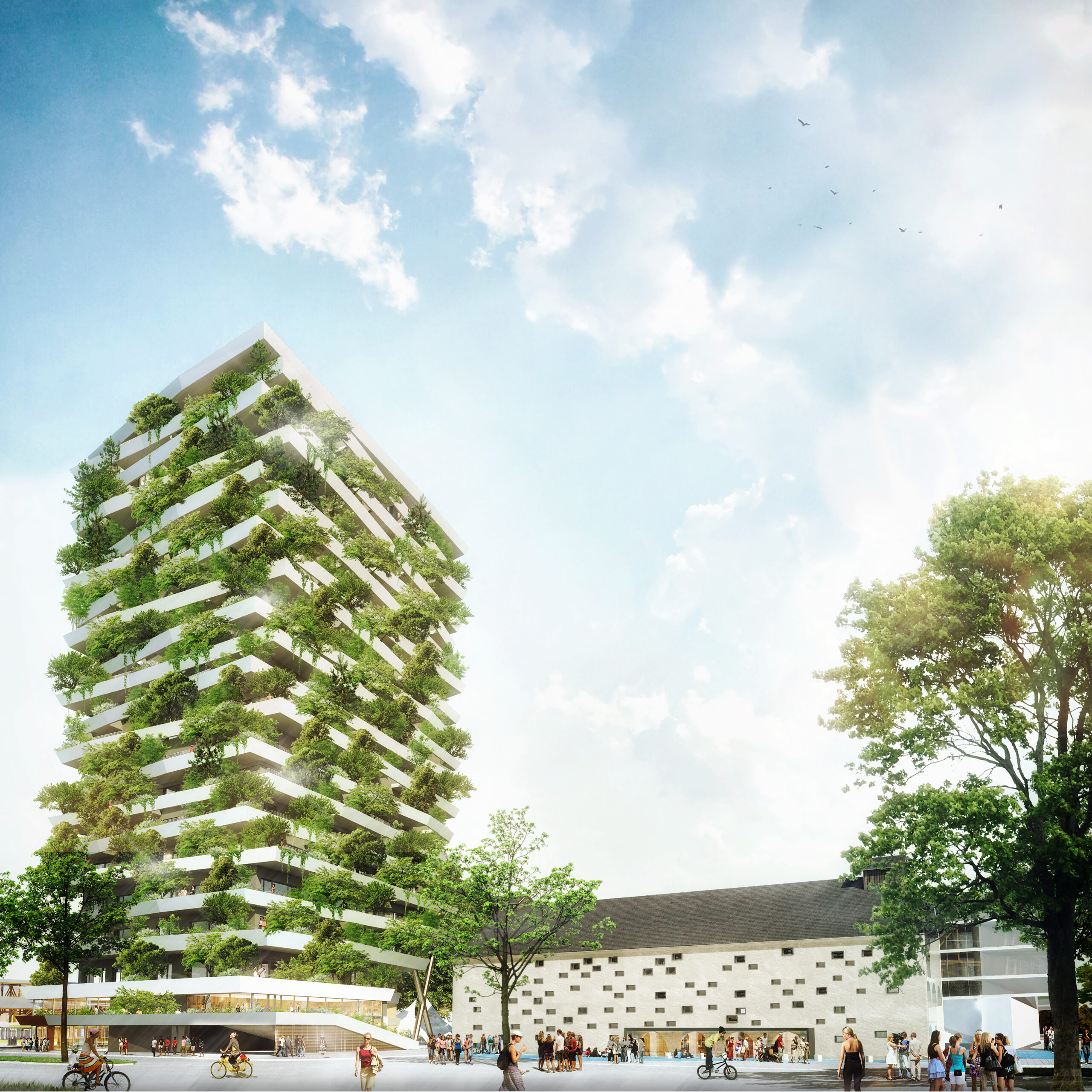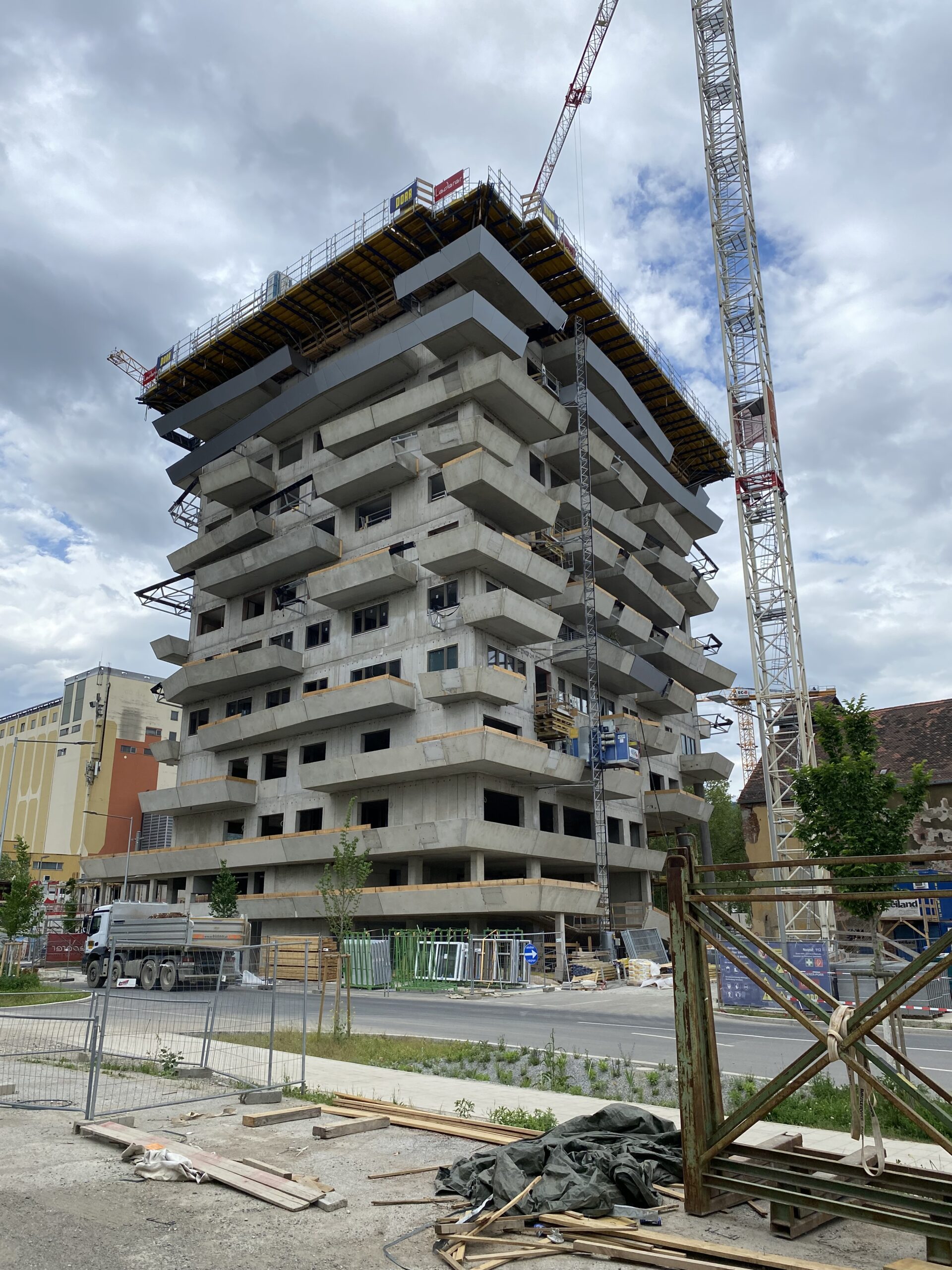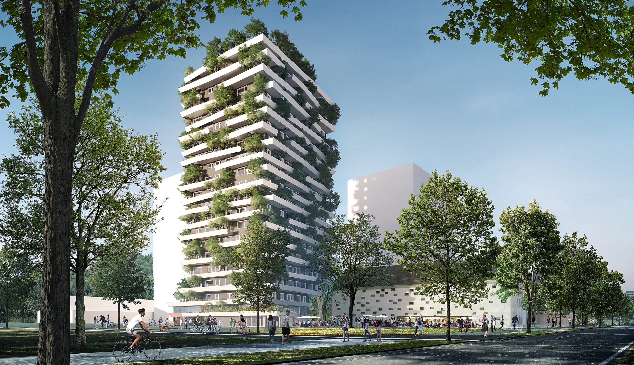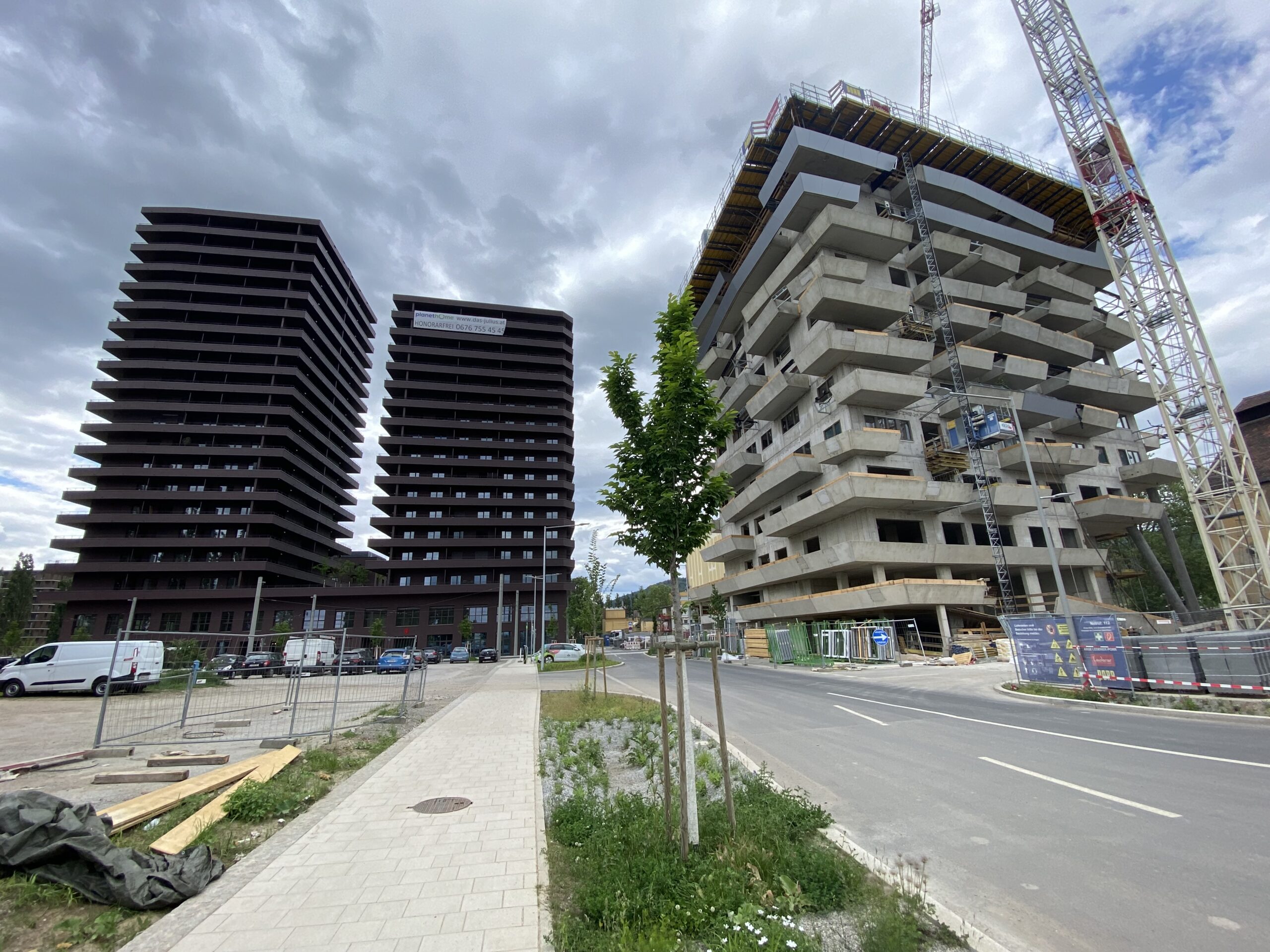 Herzstück ist der „Green Tower“, ein rund 70 m hoher Wohnturm mit begrünten Balkonen. Den Auftrag für die Errichtung der 4 Baukörper und der auf dem Areal befindlichen Tiefgarage konnte sich die ARGE Lederer-Porr sichern.
