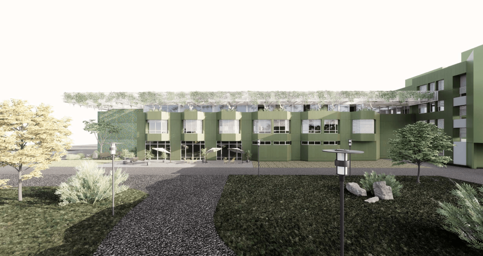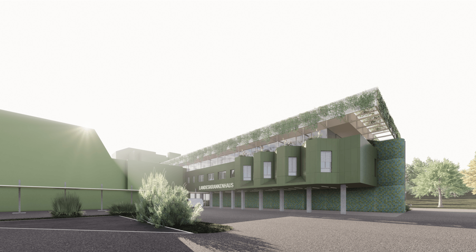 Am Standort Deutschlandsberg wurde eine neue Palliativstation mit 8 Betten errichtet. Hierfür wurde der C-Trakt aufgestockt. Da der Bestand für eine derartige Aufstockung nicht ausgelegt ist, wurde die Aufstockung in Leichtbauweise durchgeführt, Bauteil-Verstärkungen in Form von CFK-Lamellen waren nötig. Neben einer Bestandsaufnahme und statischen Überprüfung des Gebäudes war die Thomas Lorenz ZT GmbH bei diesem Projekt für die komplette Tragwerksplanung zuständig. Darüber hinaus wurden die Innocad Architekten bei der Hochbauplanung unterstützt.